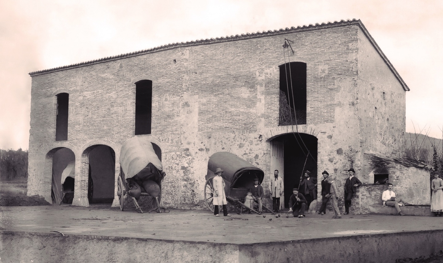 Un grup de persones davant dels porxos de la masoveria de Can Camp. Feta pels volts de l’any 1890. Foto: Lluís Marià Vidal, Fons Lluís Marià Vidal i Carreras, Arxiu Fotogràfic del Centre Excursionista de Catalunya.