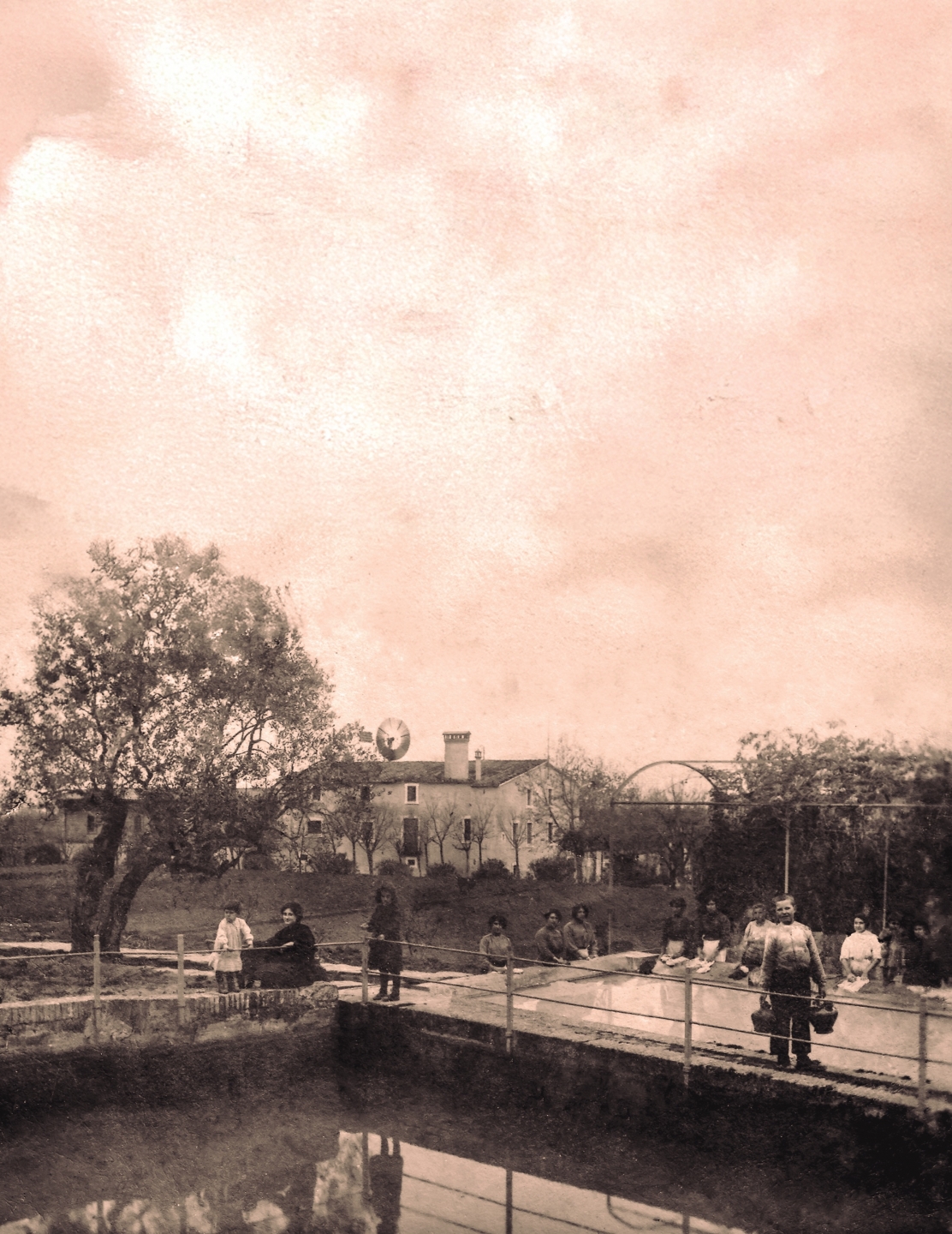 Un grup de dones i canalla al safareig de Can Camp, l'any 1917. Foto: Arxiu de l’Ajuntament de l’Ametlla del Vallès.