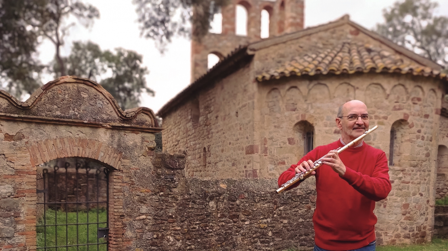 Xavier Relats amb la flauta travessera davant de l’ermita de Santa Justa i Rufina, a Lliçà d’Amunt.